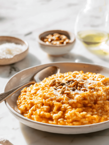 Pumpkin risotto is a creamy, comforting dish that combines the sweet earthiness of pumpkin with the rich, velvety texture of Arborio rice. It’s made by gradually stirring warm broth into sautéed onions and toasted rice, then finishing with Parmesan and butter for a glossy, tender result. The dish is topped with crunchy pumpkin seeds or herbs for added texture and color.