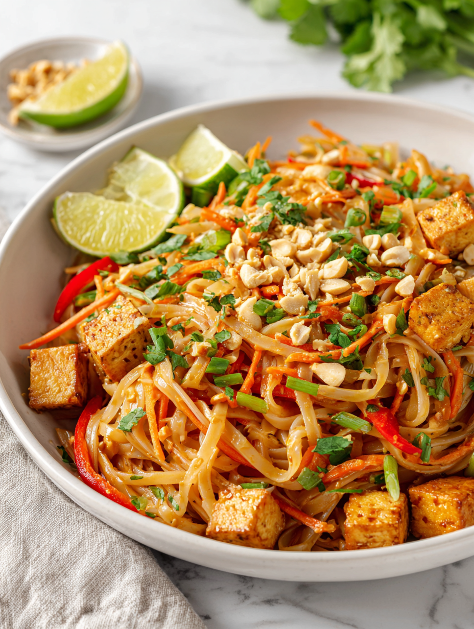 - Serve hot, garnished with lime wedges for extra brightness. Enjoy the vibrant, flavorful, and plant-based take on street-food classic Pad Thai!
